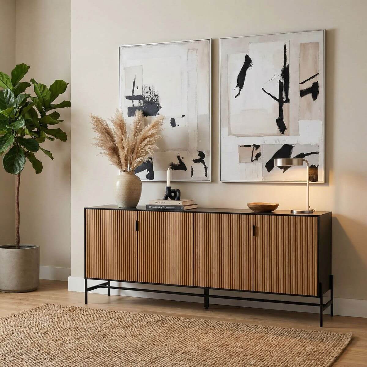 This elegant sideboard combines contemporary design and functionality to bring style and organization to any room. Its structure features a natural wood finish with vertically grooved doors, creating a sophisticated texture that adds warmth to the space.
