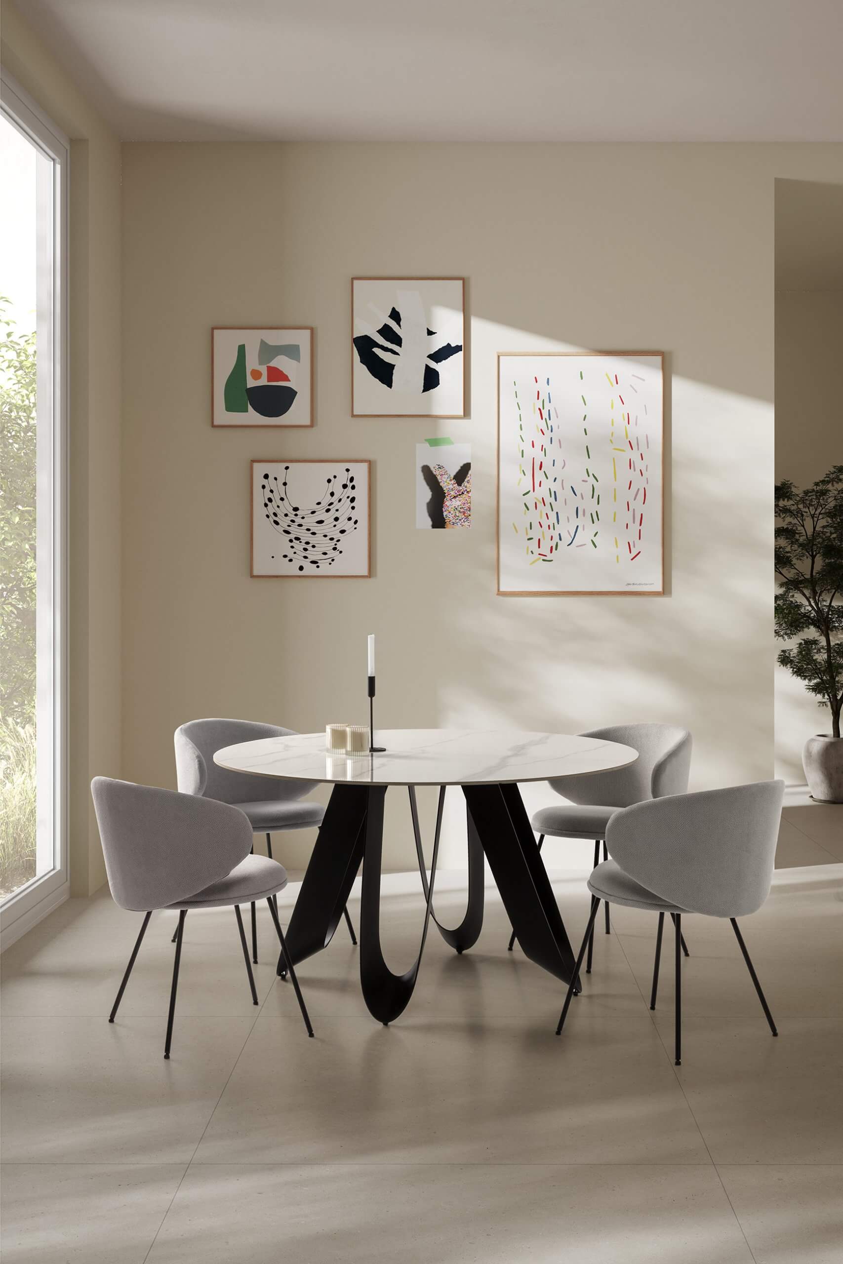 Elevate the style of your dining room with this stunning contemporary table. Its large, circular, clear porcelain top adds a sophisticated and luminous touch, while the sculptural black metal base creates a modern and elegant effect. It combines luxury and functionality in a single piece that won’t go unnoticed!