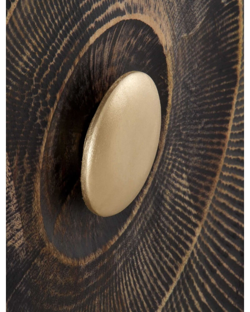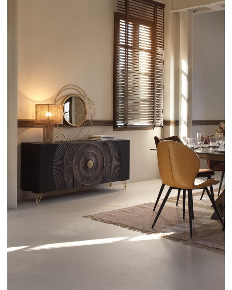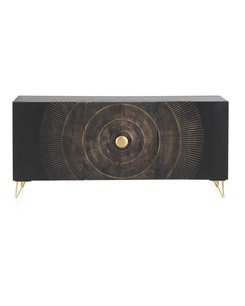 Este sofisticado aparador combina líneas limpias con un impactante diseño frontal de relieves circulares, creando una pieza decorativa que no pasa desapercibida. Su acabado en negro profundo contrasta de forma elegante con los detalles dorados, tanto en el centro ornamental de las puertas como en sus estilizadas patas metálicas, aportando un aire moderno y exclusivo.