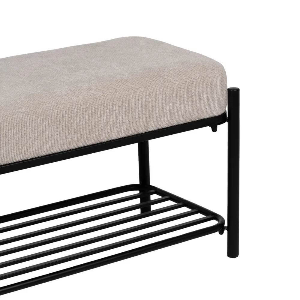 Actual banqueta en metal negro, con tapizado beige, que será una pieza practica y decorativa para un dormitorio o un hall.